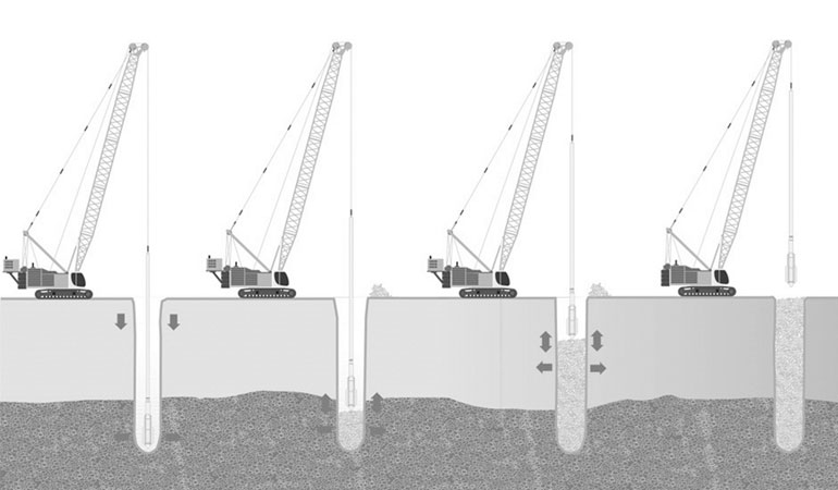 The primary mechanism of vibro replacement involves the creation of dense stone columns within the soft soil mass. These columns are formed by inserting a vibrating probe into the ground and injecting granular material, typically gravel or crushed stone, as the probe is withdrawn. The vibrations from the probe liquefy the surrounding soil, allowing the granular material to penetrate and displace the soft soil. The compacted stone columns provide structural reinforcement and drainage paths, significantly improving the soil's strength and load-bearing capacity.